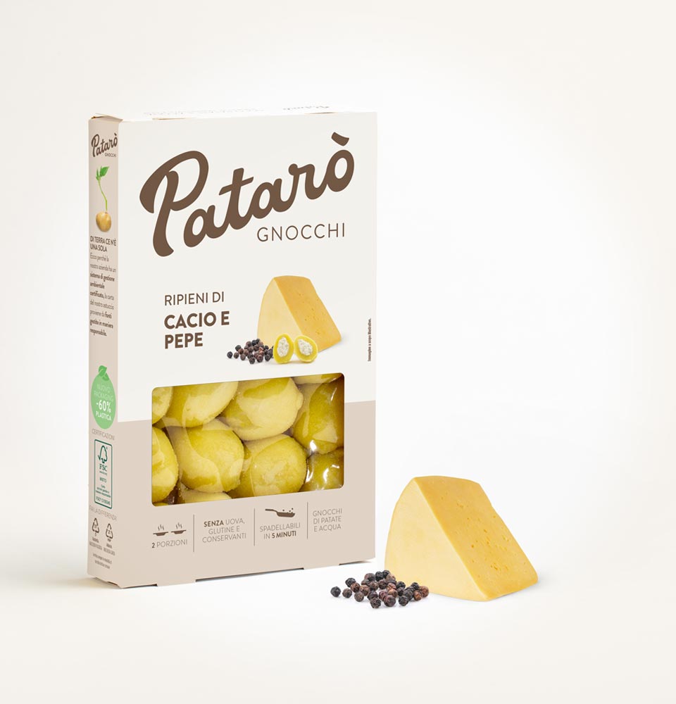 Dall’incontro fra la semplicità dell’impasto di sole patate e acqua degli Gnocchi Patarò e una ricetta tipica dell’agro romano, nata in maniera spontanea fra i pastori in periodo di transumanza, nasce una nuova ricetta che unisce gusto e tradizione, gli gnocchi ripieni di cacio e pepe. Senza uova, glutine e conservanti, questi gnocchi ricchi di sapore, racchiudono un cuore di pecorino e pepe che donano un carattere unico al piatto, e sono pronti in pochi minuti, per un pranzo che assicura grande soddisfazione in pochi istanti.