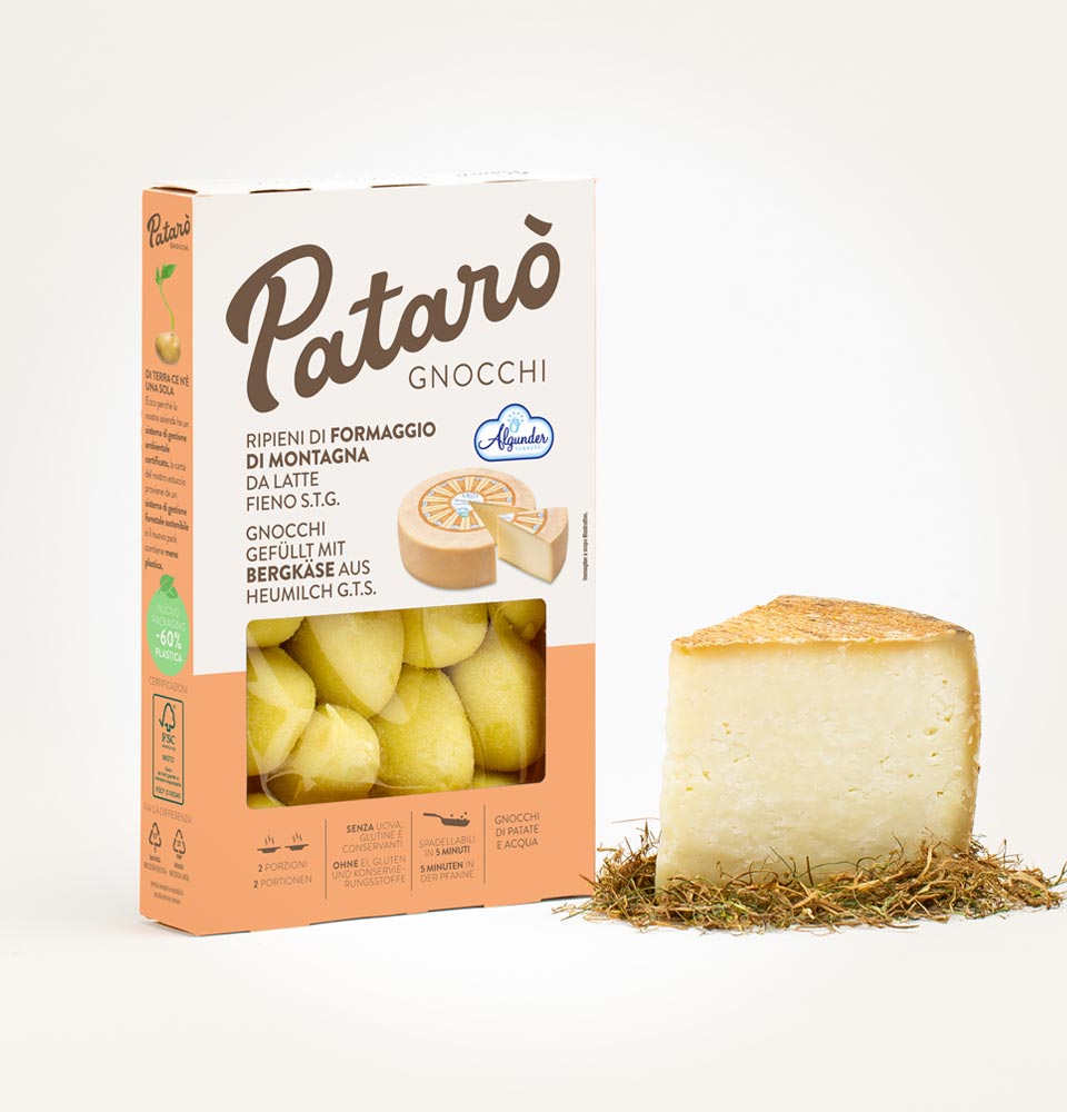 A volte basta un assaggio per viaggiare con gusto. Ecco perché ai nostri gnocchi di solo patate e acqua abbiamo aggiunto un ricco e genuino ripieno, a base di formaggio di montagna da latte fieno, un latte ricavato da mucche nutrite con il 75% di fieno, senza foraggi fermentati o mangimi OGM. Questo vuol dire un gusto dolce, profumato e genuino, perfetto per piatti delicati e irresistibili.